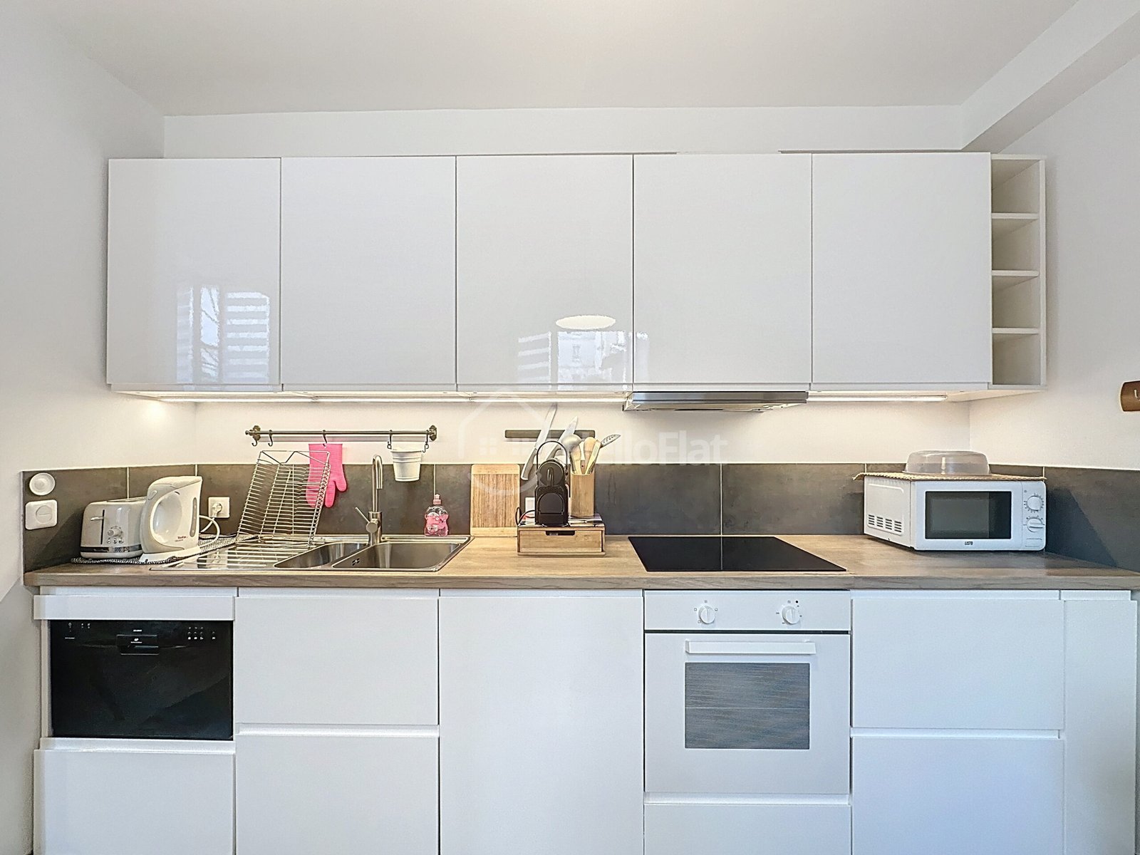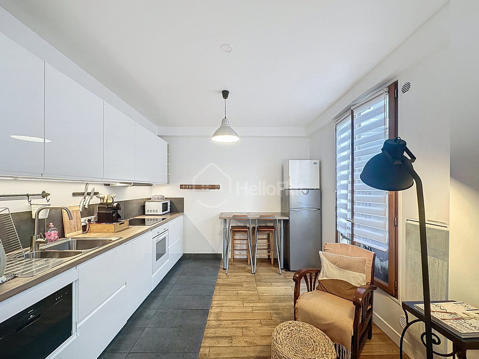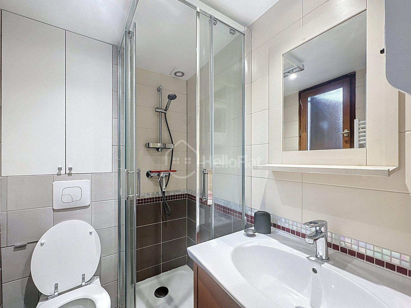 La salle de bain est équipée d’une douche, d’un lavabo avec meuble de rangement et de WC. L’appartement offre un cadre de vie chaleureux, fonctionnel et optimisé, idéal pour profiter d’un logement calme tout en restant proche des commodités.