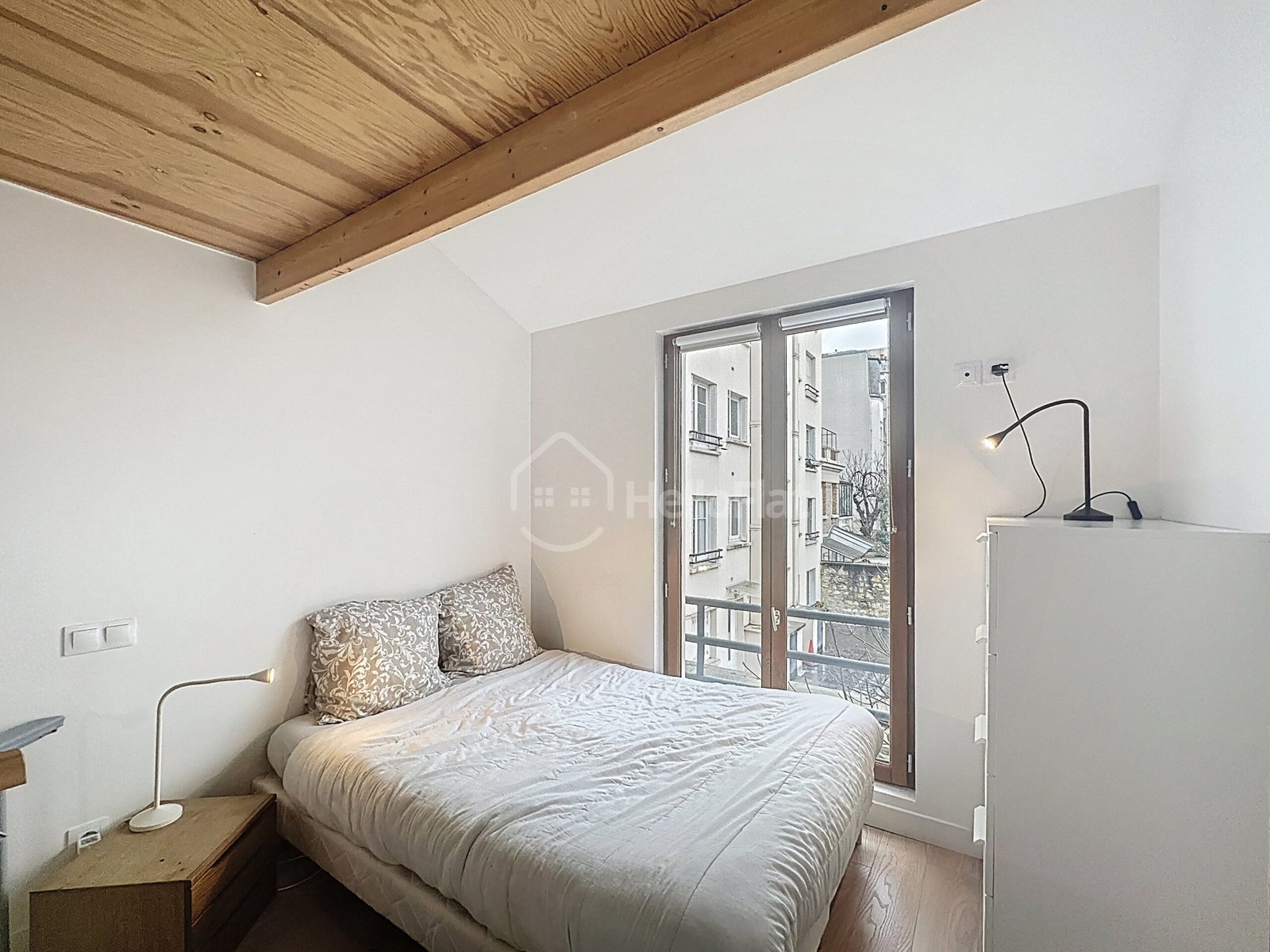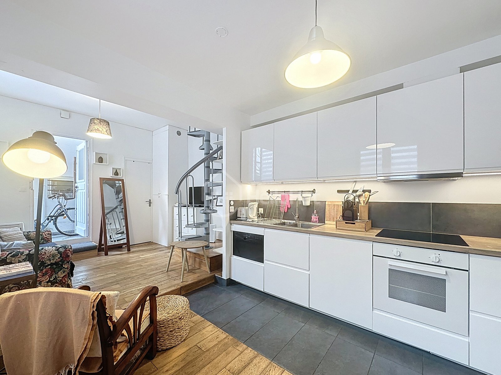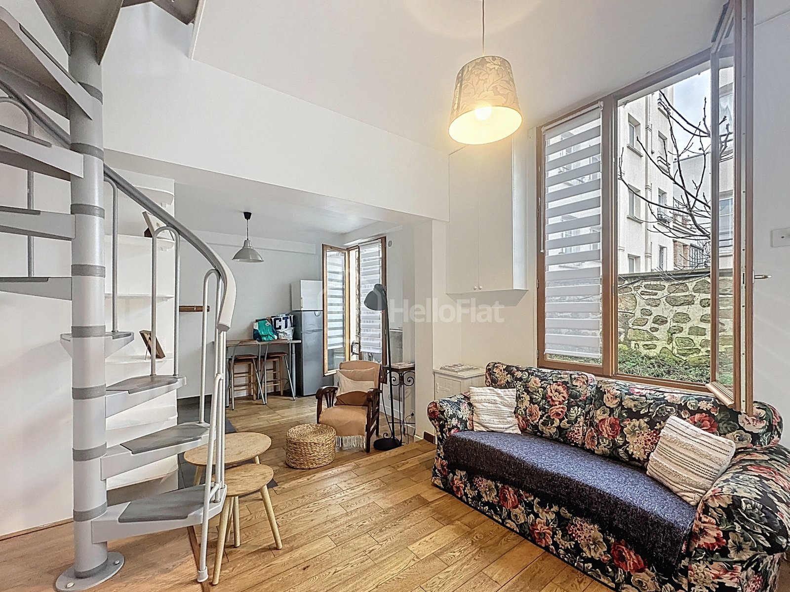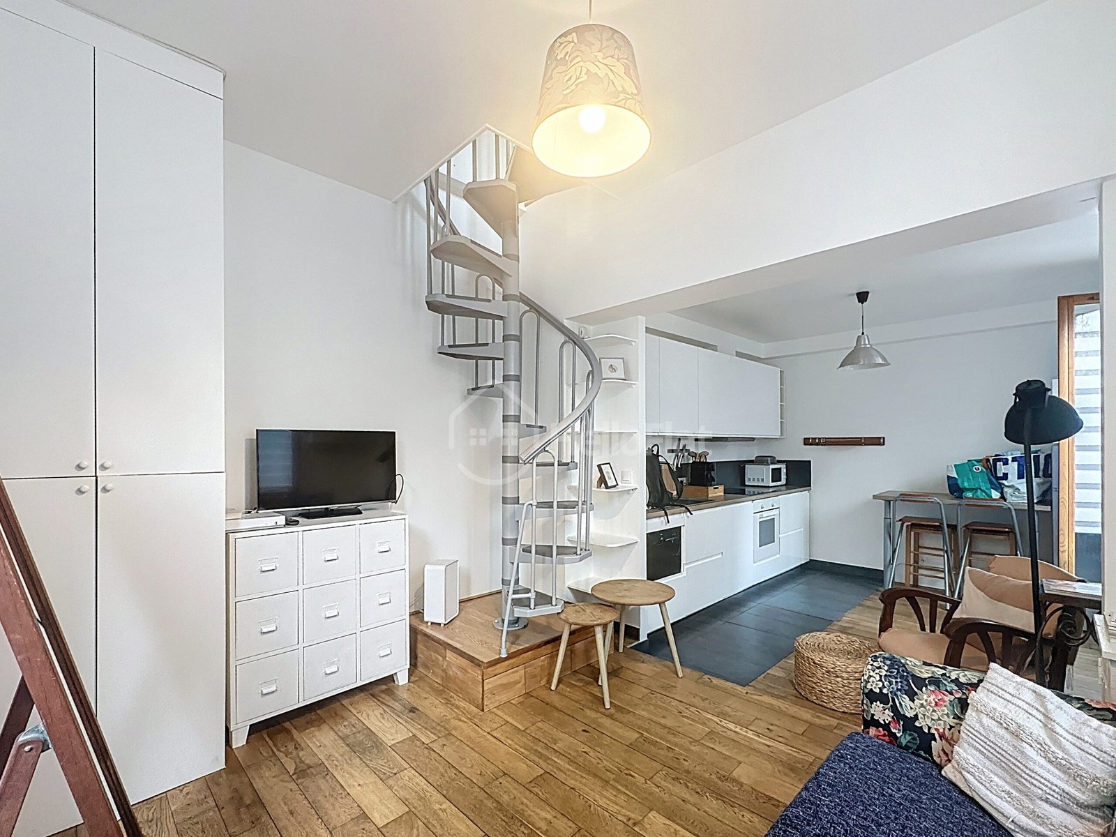 Un escalier en colimaçon mène à l’étage où se trouve l’espace nuit, comprenant une chambre confortable avec lit double et rangements.